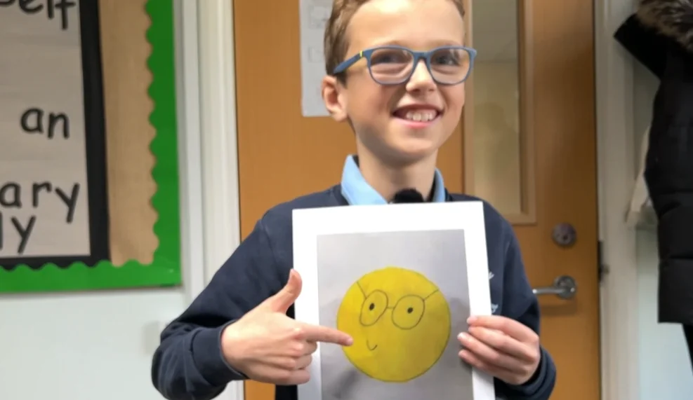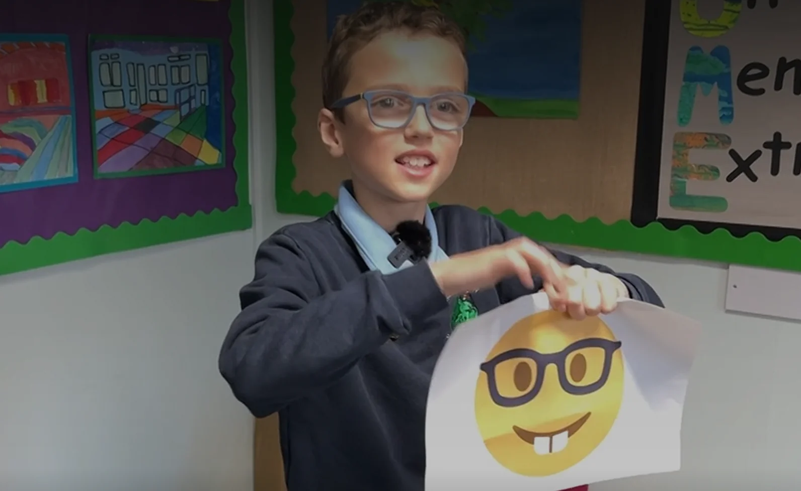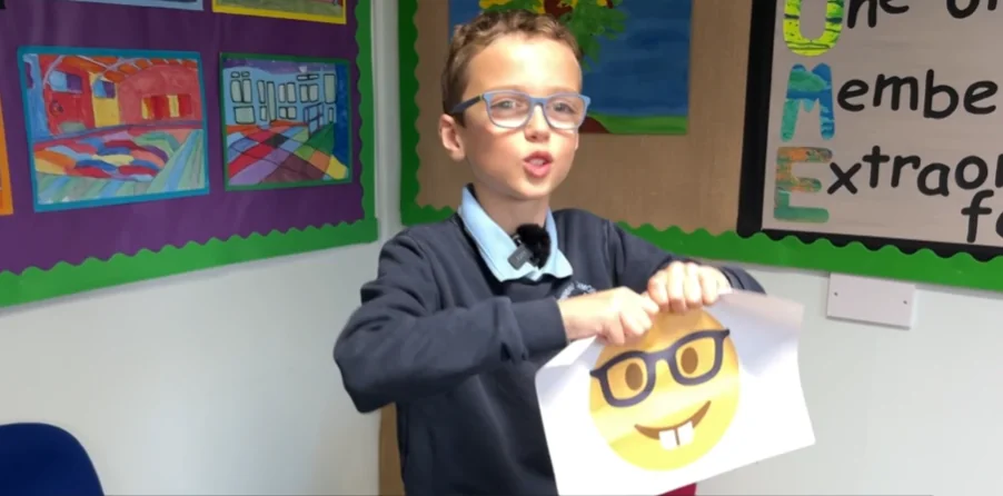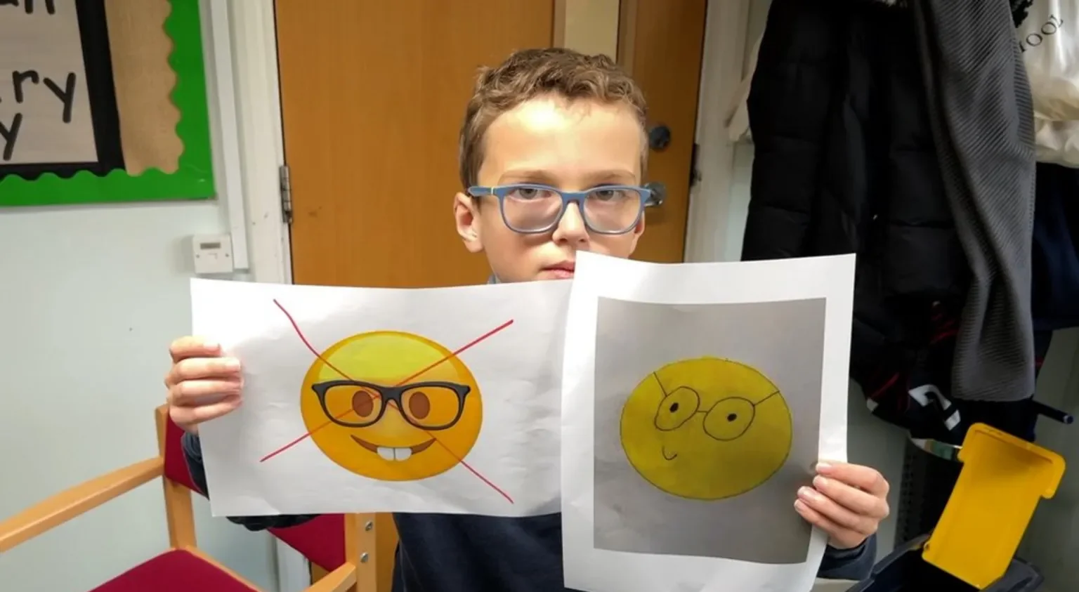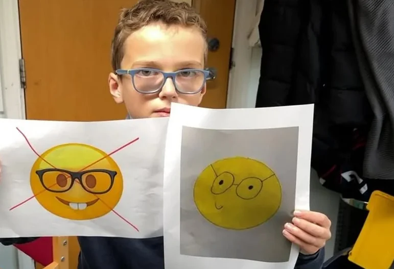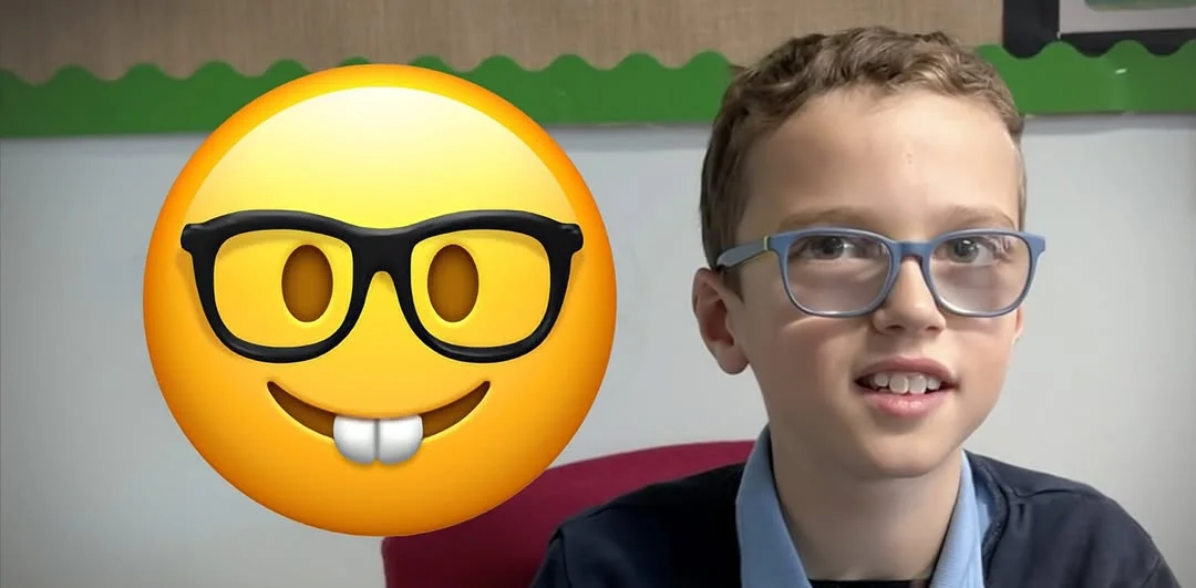 Orgulhoso por usar óculos, o menino criou sua própria versão do ícone, que apelidou de “emoji gênio”. No lugar do sorriso aberto com dentes, ele propôs uma expressão mais discreta e lentes mais finas. “Tem lentes e armações finas… e um rostinho sorridente em vez daqueles dentes horríveis. Eu gosto de usar óculos porque eles me ajudam a ver melhor e são estilosos”, explicou.