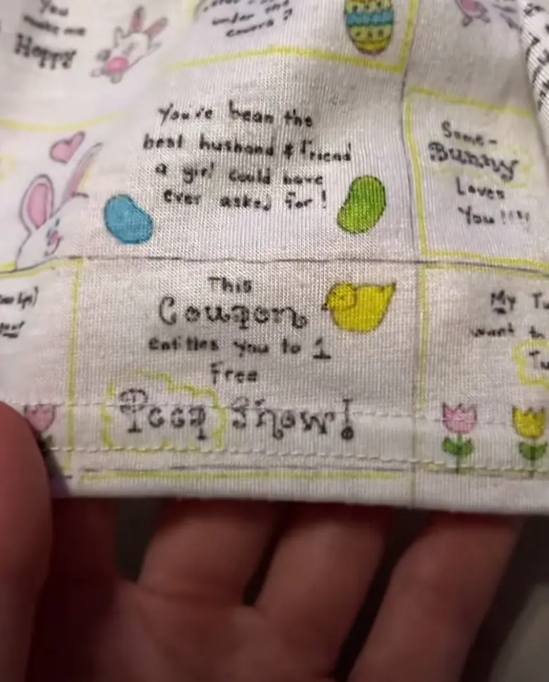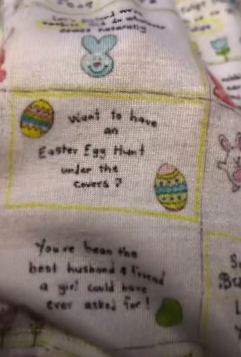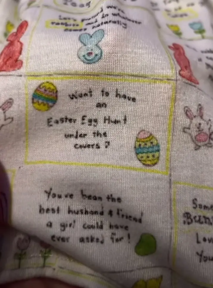 Entre as mensagens estavam: “Quer fazer uma caça aos ovos de Páscoa debaixo das cobertas”, “Este cupom dá direito a um show de strip grátis” e “Vamos fingir que somos coelhos e fazer o que vier naturalmente”. Outra frase dizia: “Minhas tulipas querem estar nas suas tulipas”. Para Savannah, a pior delas era: “Você foi o melhor marido e amigo que uma garota poderia ter desejado”.