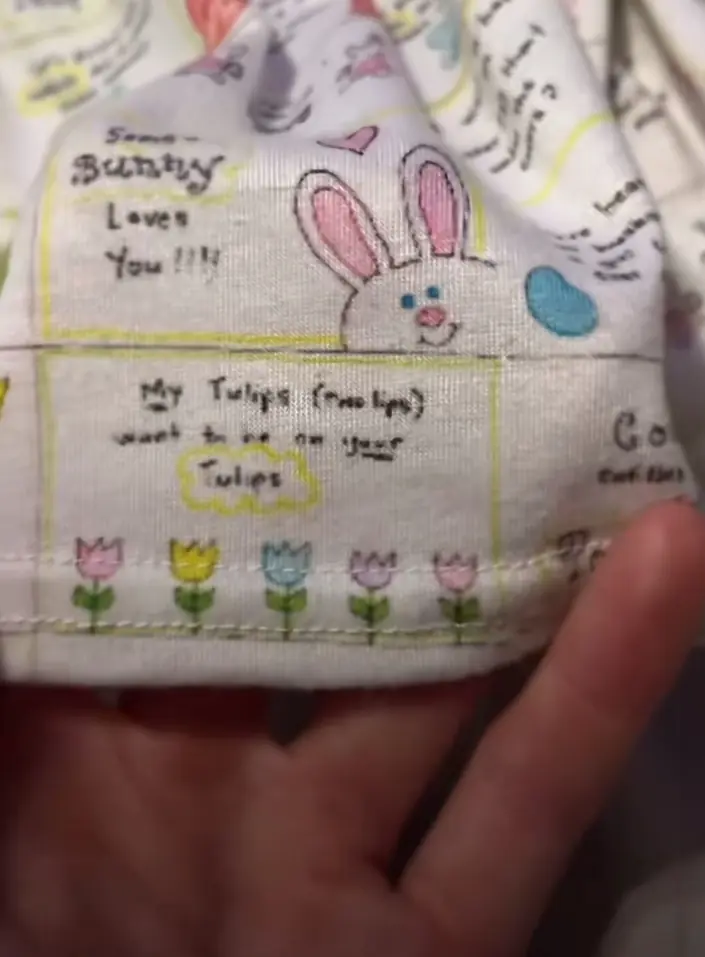 A mulher contou que a peça trazia desenhos de coelhos, ovos e flores, mas o que chamou atenção foram as frases estampadas no tecido. “Quando ela estava cochilando um dia, decidi ler o que o texto realmente dizia”, relatou no vídeo, que já ultrapassa 31 milhões visualizações. Na legenda, escreveu: “Por favor, leia e olhe cuidadosamente as roupas de seus filhos antes de comprá-las”.