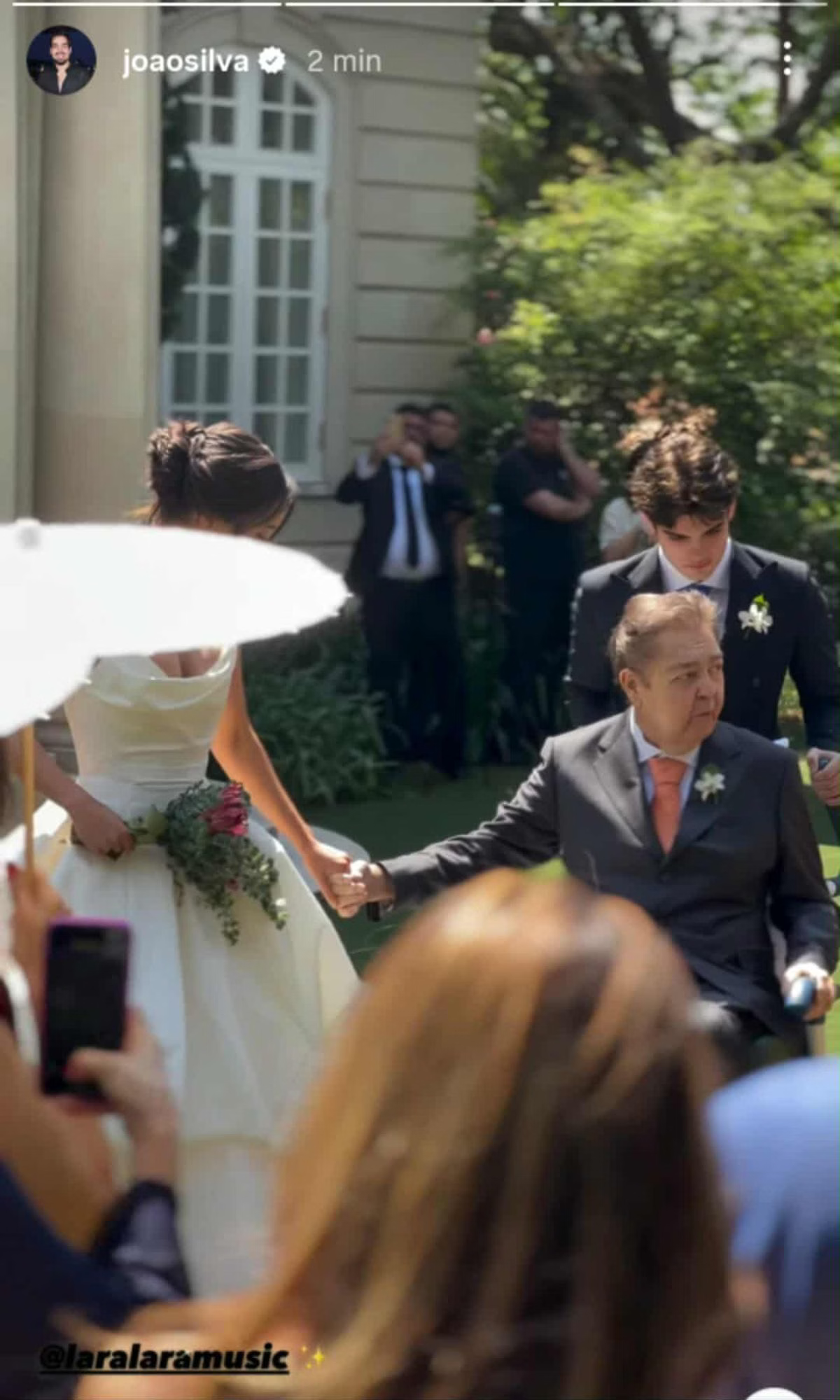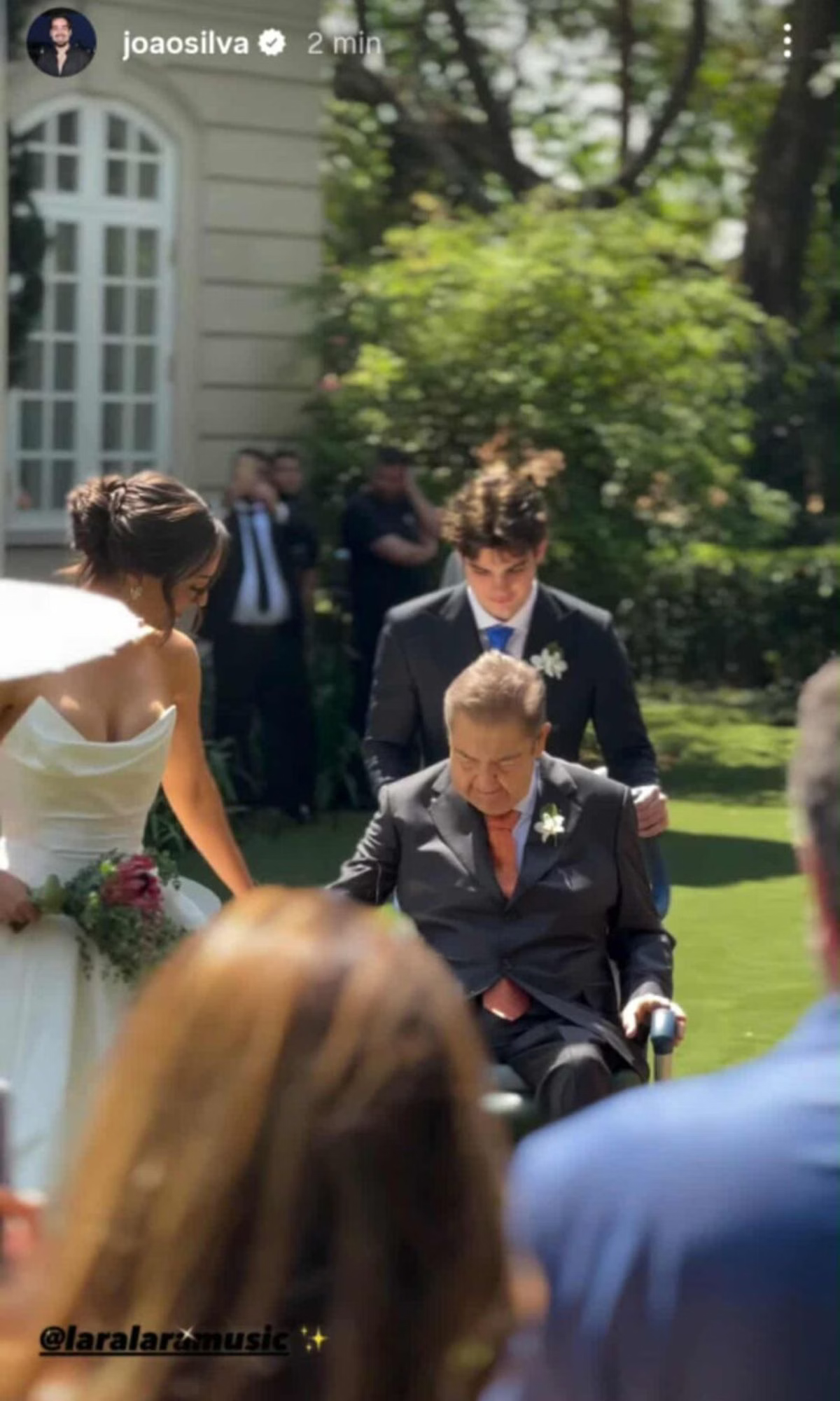 Um dos momentos mais emocionantes do evento foi a entrada de Lara ao altar, acompanhada pelo pai. Faustão, que se recupera de dois transplantes recentes — um de rim e outro de fígado —, apareceu em uma cadeira de rodas ao lado da filha. Imagens divulgadas por João Silva, irmão de Lara, mostraram o apresentador visivelmente emocionado. Rodrigo Silva, o filho caçula de Faustão, também esteve presente na celebração.