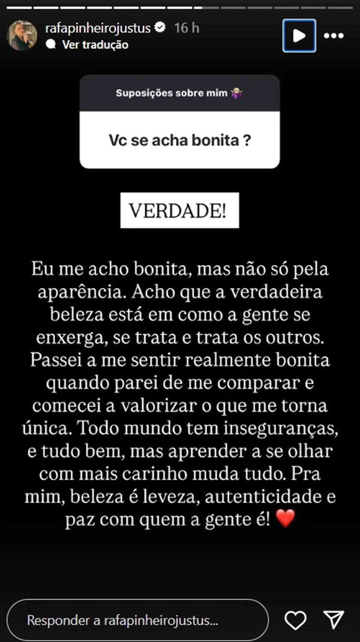 A jovem contou que passou a se sentir verdadeiramente bonita quando deixou de se comparar com outras pessoas e começou a valorizar suas características únicas. “Todo mundo tem inseguranças, e tudo bem, mas aprender a se olhar com mais carinho muda tudo”, afirmou. Para ela, a beleza está na leveza, autenticidade e paz interior.