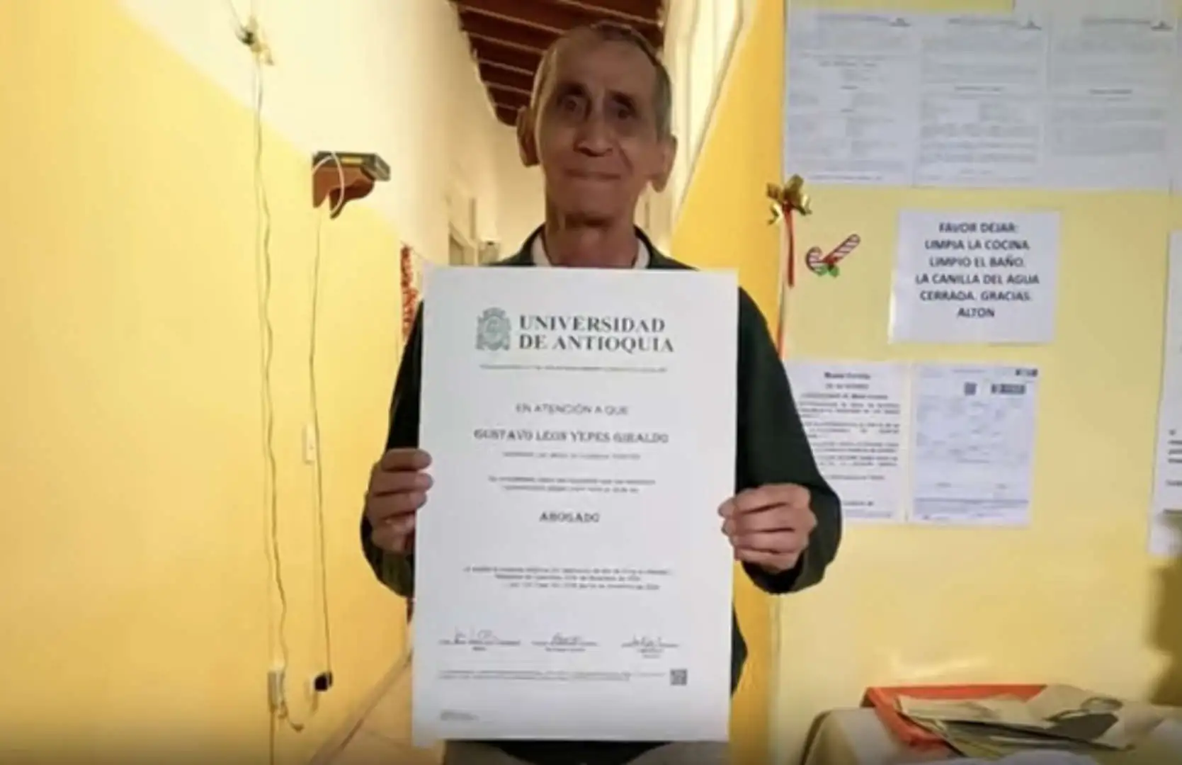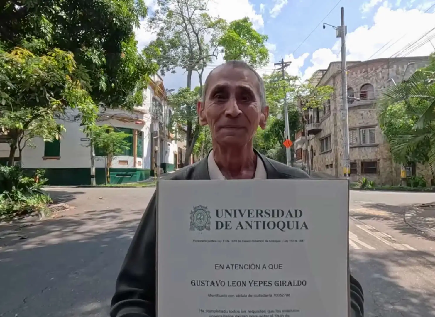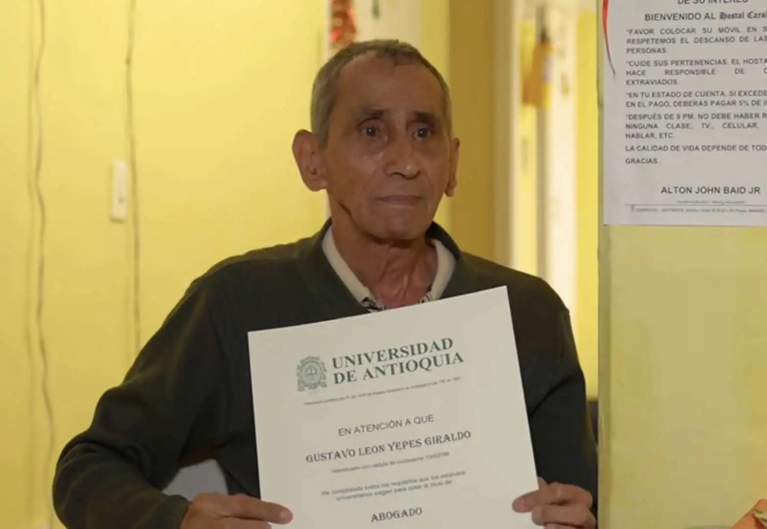 Aos 70 anos, Gustavo Yepes Giraldo concluiu a graduação em Direito na Universidade de Antioquia, em Medellín, Colômbia, após mais de duas décadas vivendo em situação de rua. A formatura marcou o fim de um percurso interrompido por vícios e exclusão social, iniciado ainda nos anos 1970.