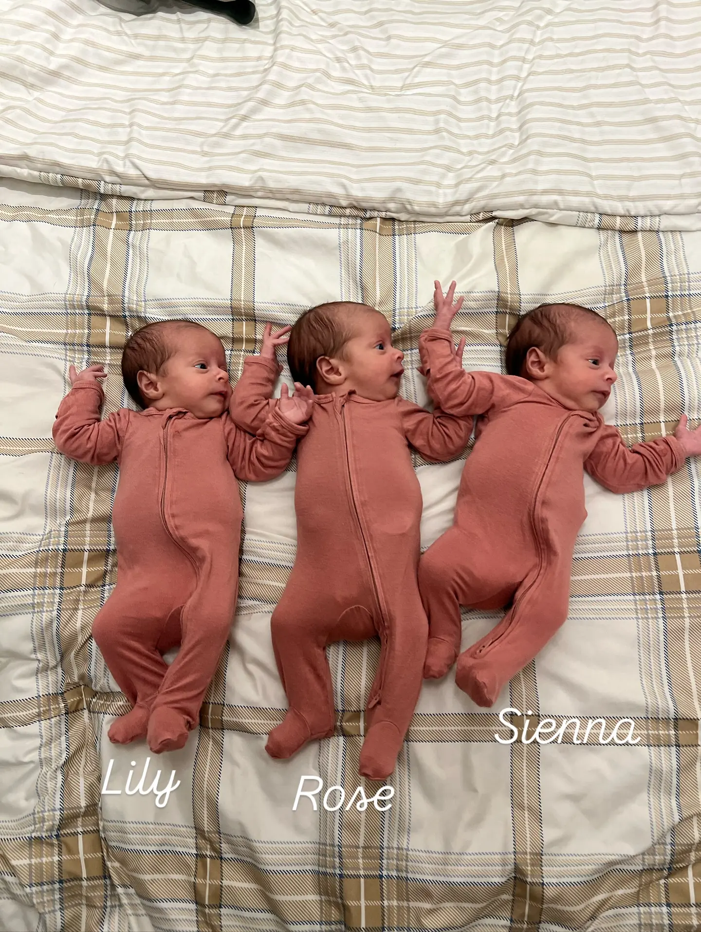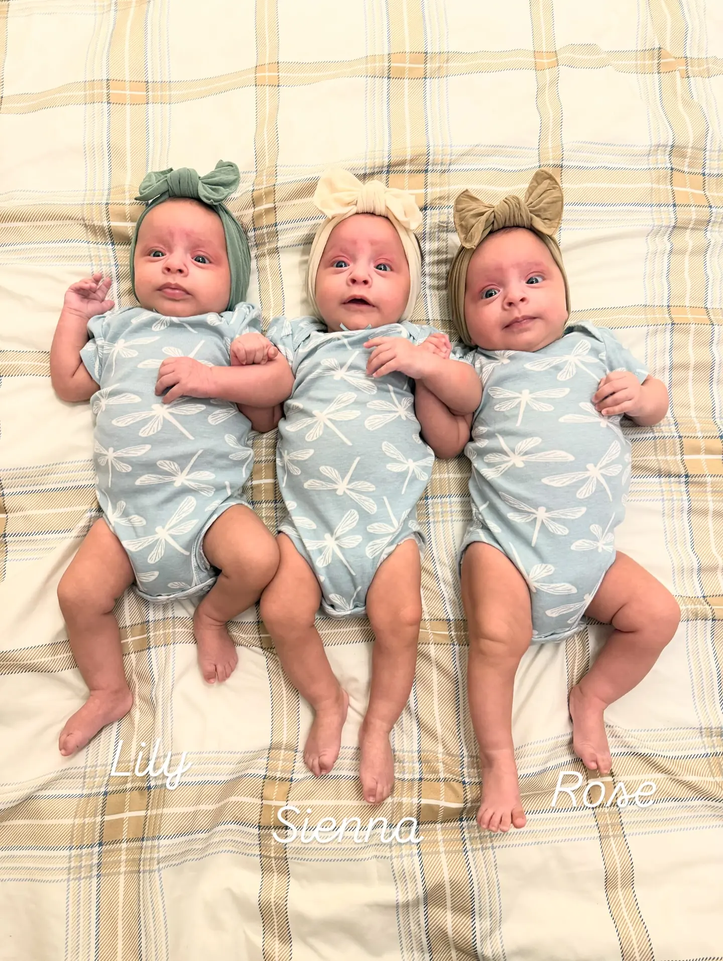 A gestação ocorreu bem, e no dia 25 de junho, com 33 semanas, chegaram Sienna, Rose e Lily, cada uma pesando cerca de 1,3 kg. “Elas nasceram uma depois da outra, chutando e chorando”, relatou Nick. Segundo o casal, o parto contou com cerca de 21 profissionais, incluindo a equipe da médica Pluym. “Cada bebê tinha três pessoas dedicadas, sua própria equipe. Por mais caótico que fosse para mim, não era para eles. Todos estavam prontos e preparados”, disse Jocelyn.