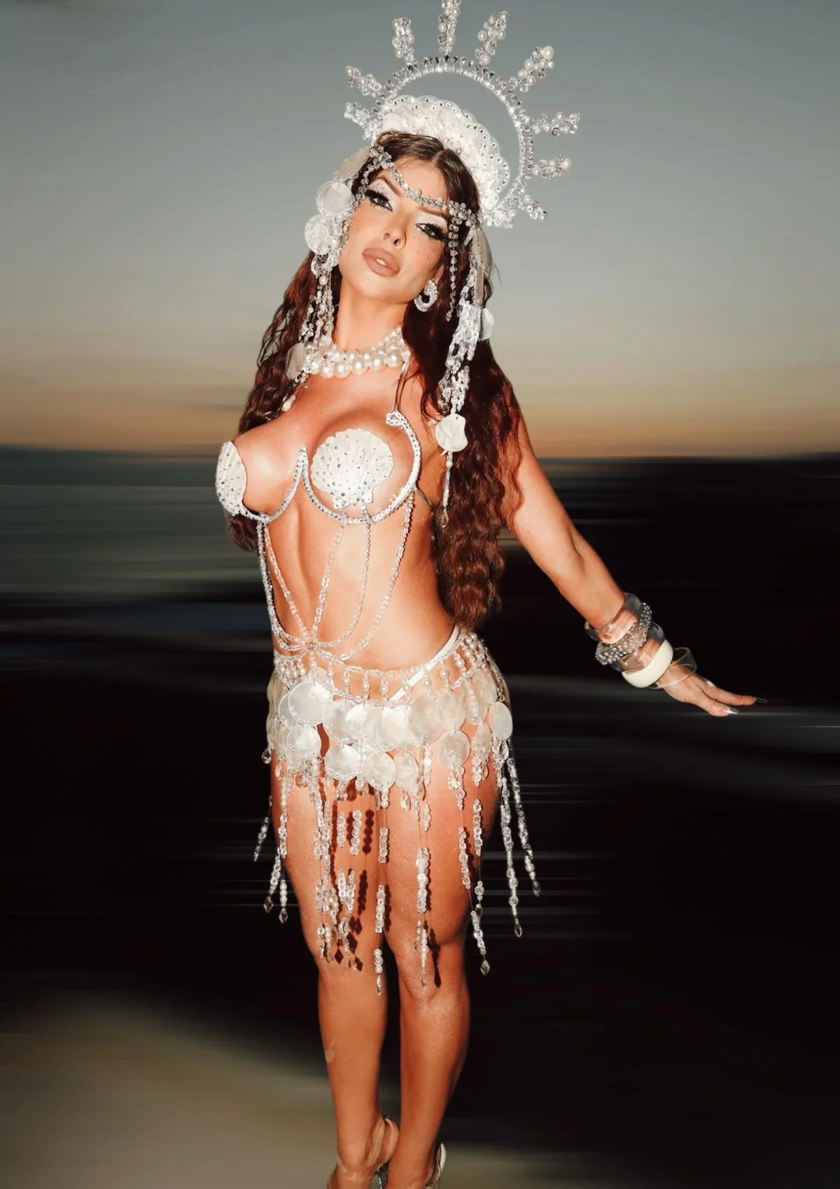 Jaquelline Grohalski, conhecida por sua participação no BBB e em A Fazenda, atraiu todos os olhares durante o primeiro mini desfile da Grande Rio, realizado neste domingo (30/11), na Cidade do Samba, no Rio de Janeiro. Como musa da escola, ela revelou com exclusividade os detalhes de seu traje feito à mão, decorado com pérolas, conchas e strass. O item mais impressionante do visual foi o acessório de cabeça, que pesa cerca de quatro quilos.