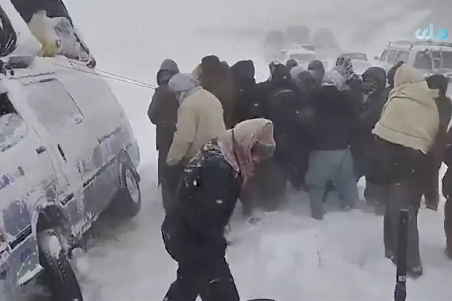 Moradores lutam para resgatar veículo preso na neve após chuvas e nevascas no Afeganistão (Foto: Instagram)