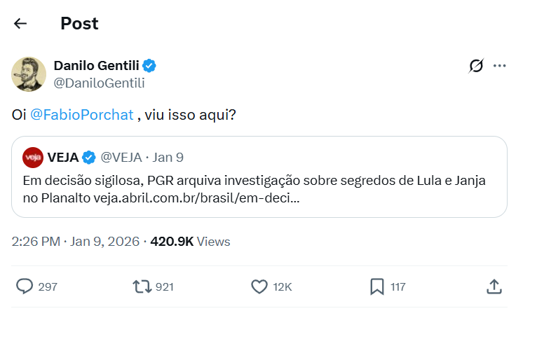 Ao retomar a declaração, Gentili compartilhou uma reportagem da revista Veja que informava o arquivamento, em decisão sigilosa, de uma investigação da Procuradoria-Geral da República (PGR) sobre supostos “segredos” envolvendo o presidente Luiz Inácio Lula da Silva e a primeira-dama Janja no Palácio do Planalto. Na legenda, o humorista escreveu: “Oi @FabioPorchat, viu isso aqui?”, questionando se o apresentador manteria o mesmo posicionamento diante de um caso semelhante envolvendo o atual governo.