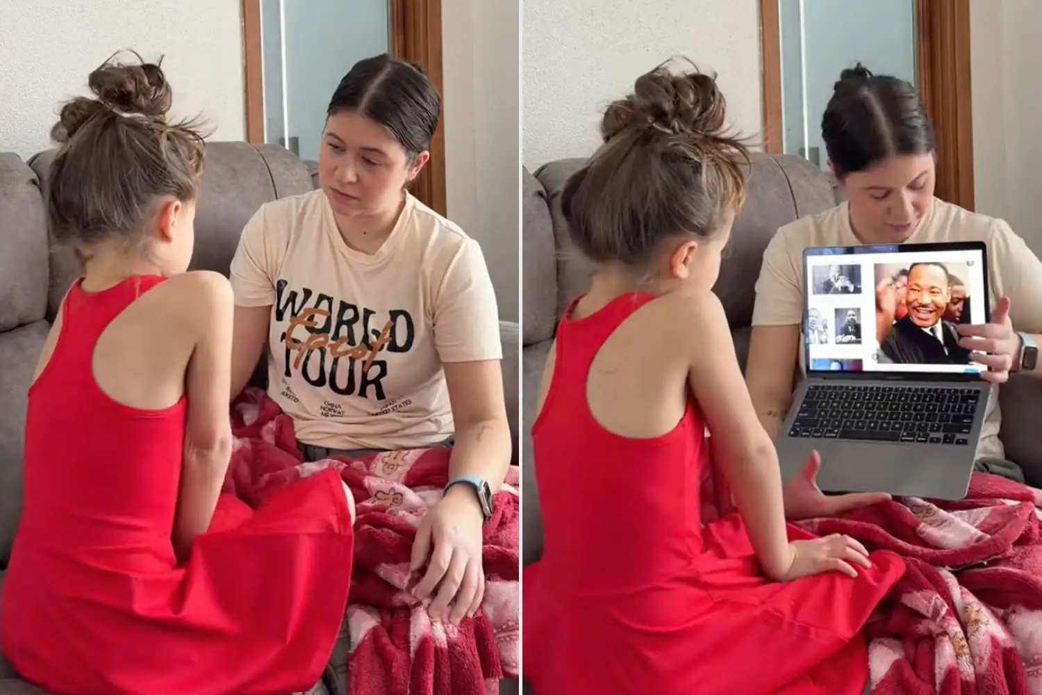 “Racismo, ou ser racista, é tratar alguém de modo diferente por causa da cor da pele”, explica a mãe, em meio a fotos de Martin Luther King Jr., descrevendo-o como ativista dos direitos civis. Em seguida, aprofunda: “Há 60 anos, quem tinha pele mais escura não podia entrar em certos restaurantes nem sentar na frente do ônibus. Havia avisos que diziam ‘Somente pessoas brancas’.”