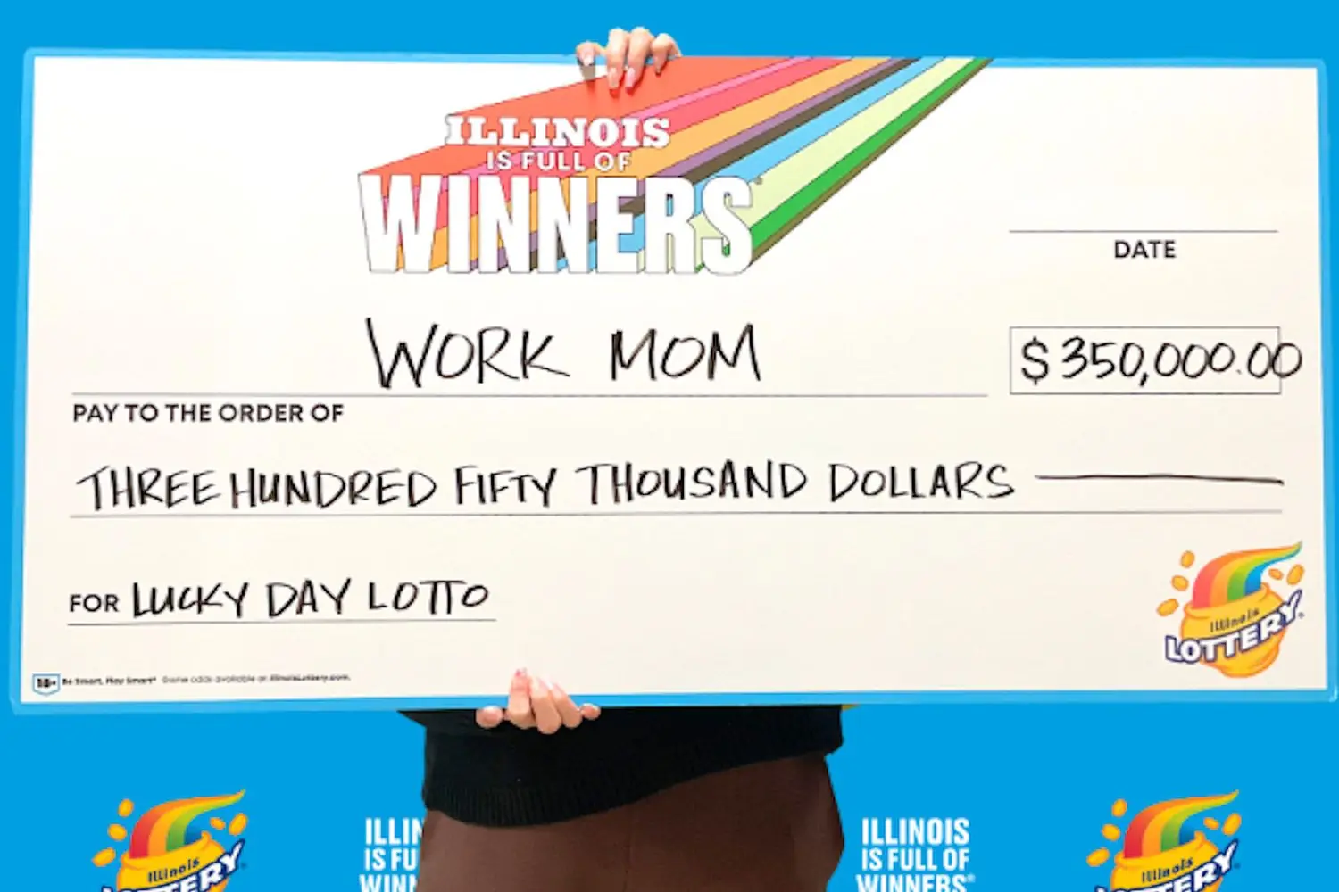 Moradora de Illinois apelidada de “Work Mom” exibe cheque de US$350 000 do Lucky Day Lotto (Foto: Instagram)
