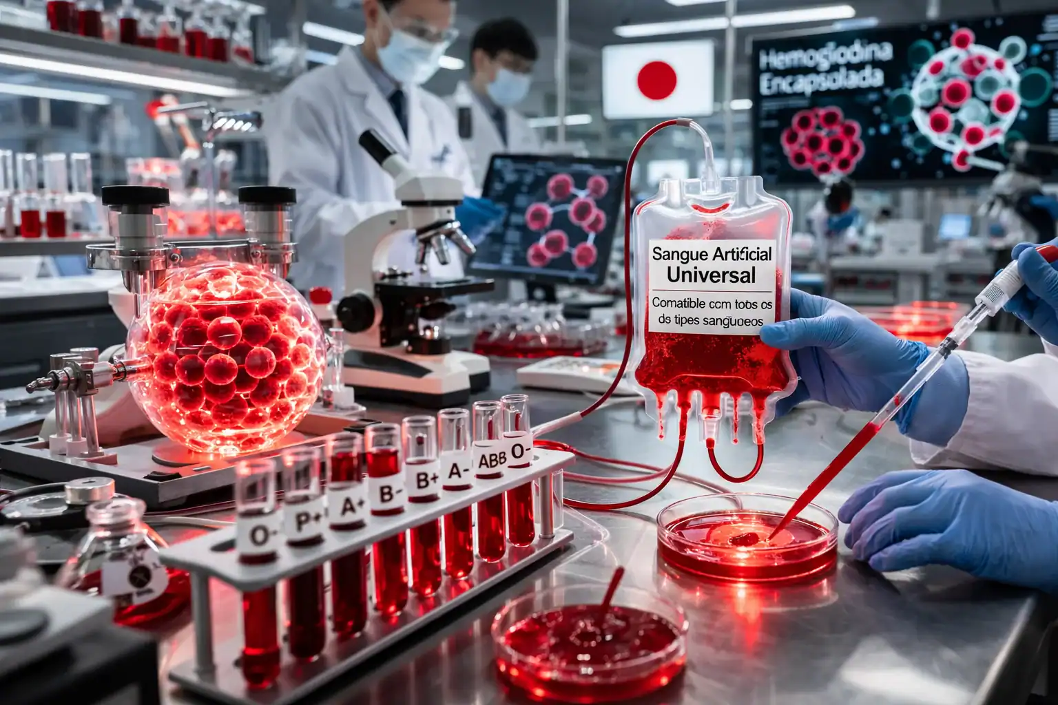 Pesquisadores da Universidade Médica de Nara, no Japão, estão desenvolvendo um sangue artificial universal compatível com todos os tipos sanguíneos, utilizando hemoglobina encapsulada sem antígenos do sistema ABO, o que pode dispensar a necessidade de tipagem antes de transfusões e ampliar a disponibilidade do recurso em contextos de emergência e falta de doações.