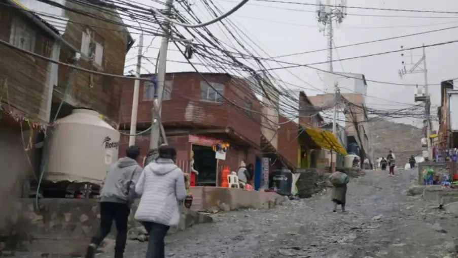 Caminhantes sob fiação exposta nas ruas precárias de La Rinconada, a cidade mais alta do mundo. (Foto: Instagram)